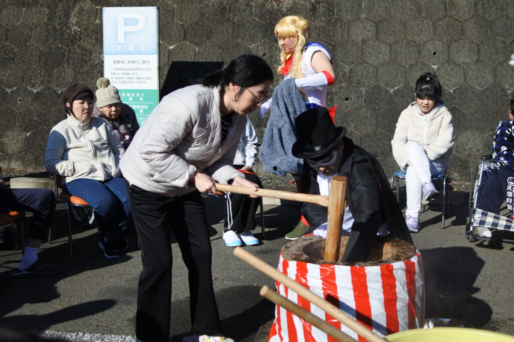 年末といえば、やはり餅つきです! 「よいしょー!」という威勢の良い掛け声とともに、力強く杵をふるいました。