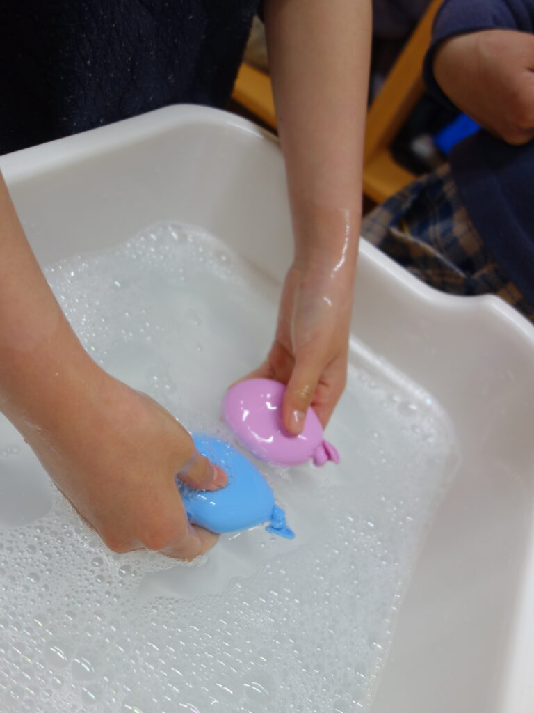 完成したスクイーズを中性洗剤を混ぜた水の中で少し擦ると表面がもっちりして、くっつけたり剥がしたりする感触が心地良いのでオススメです。