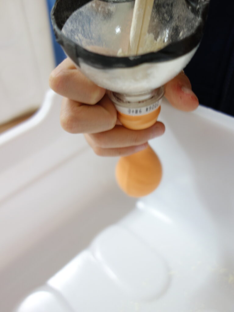 口に風船を括り付け小麦粉そジャーっと注ぎ入れます。