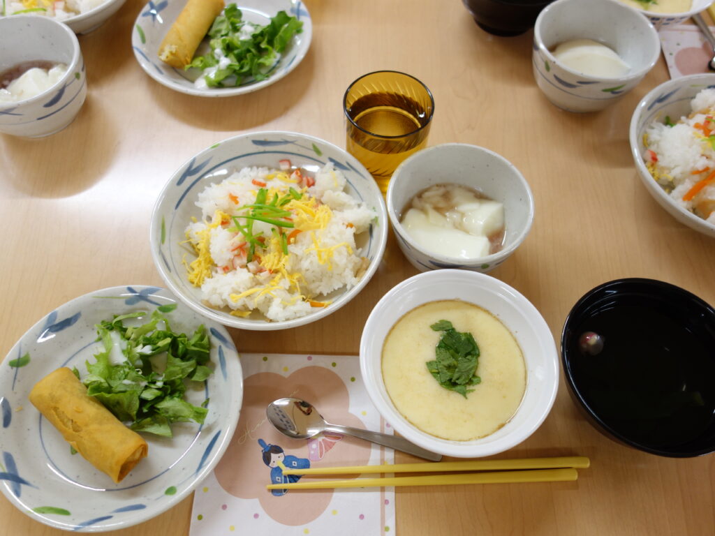 ちらし寿司に春巻き、茶わん蒸しにお吸い物、杏仁豆腐と豪華です☆