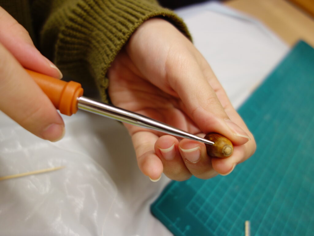 どんぐりに穴をあけて、つまようじを通して駒に!